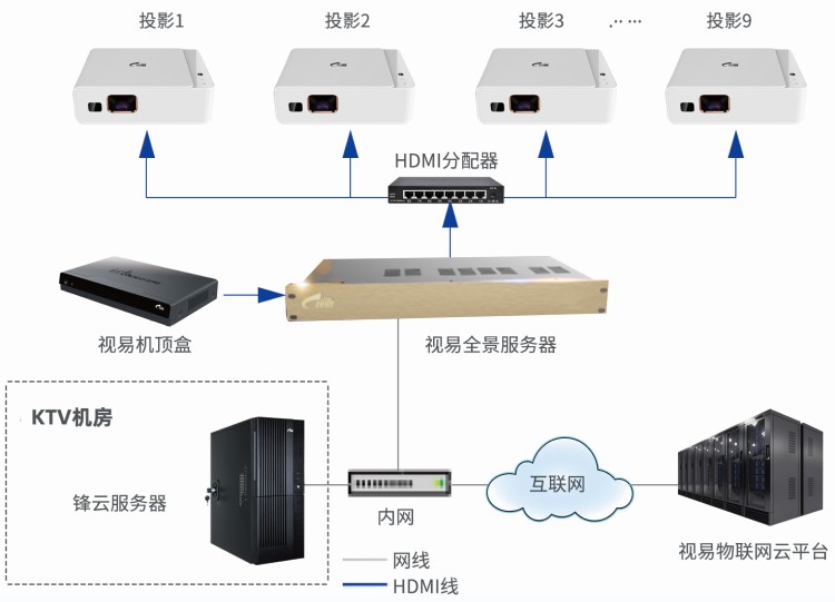 视易全景融合服务器,采用安卓系统,连接视易物联网云平台、机顶盒、视易智能投影仪,通过视频存储、播放、采集开窗、用户互动信息展示等功能,为客户提供震撼视觉的炫屏、巨幕、环幕等沉浸式娱乐体验。
